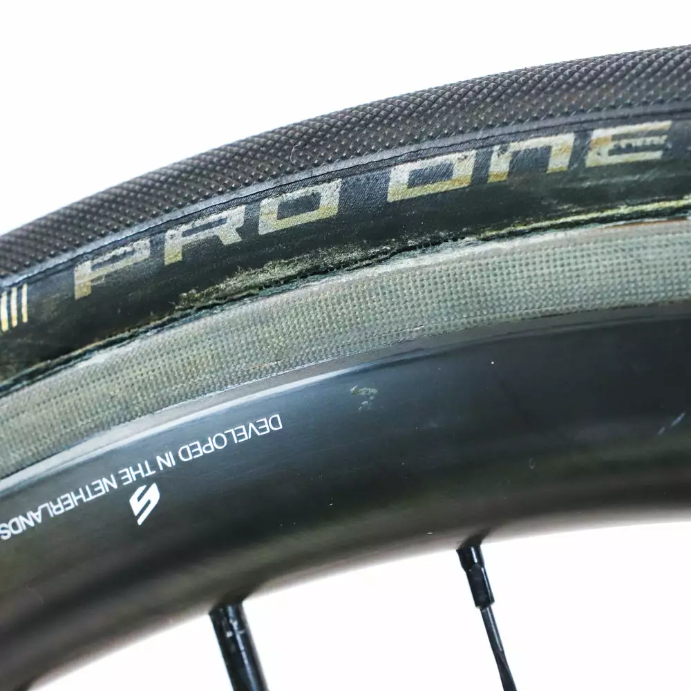 Tires: Schwalbe Pro One HT Tubular 27mm (Very good)