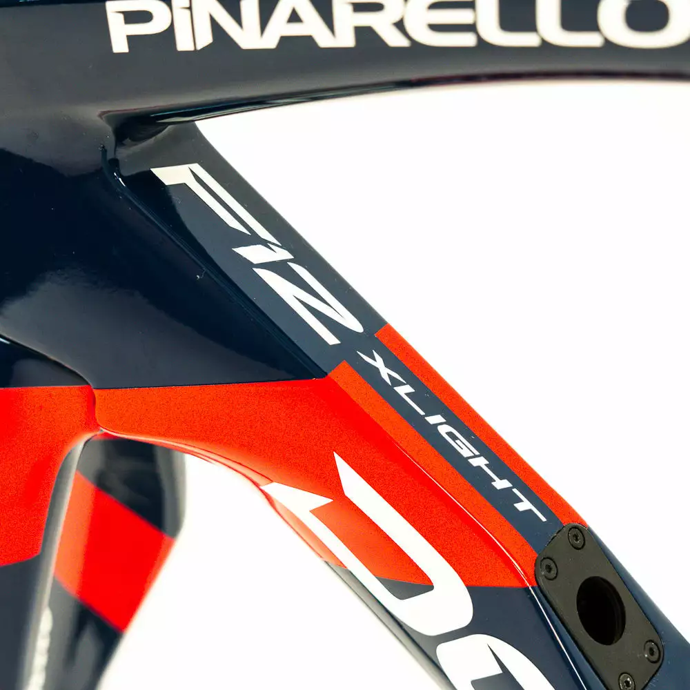 The Pinarello Dogma F is the further developed version of the Pinarello Dogma F12. The F model uses the same special Torayca 1100 1K carbon fibre as the F12. But the F frameset is still significantly lighter than the F12 frameset. A weight difference of approximately 265 grams thanks to a weight reduction of the fork, seatpost, handlebar, bearings and bolts. The twist; The Pinarello Dogma F X-Light is the weight-optimized version of the Pinarello Dogma F. The X-Light model consists of a lighter paint job and saves approximately a further 80 grams compared to the Pinarello Dogma F.