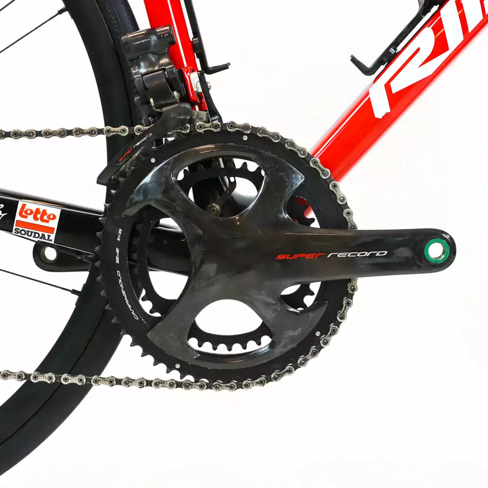 The bike is built with Campagnolo Super Record electronic EPS 12-speed groupset, team-specific carbon components, and a Campagnolo Zonda Disc clincher wheelset.