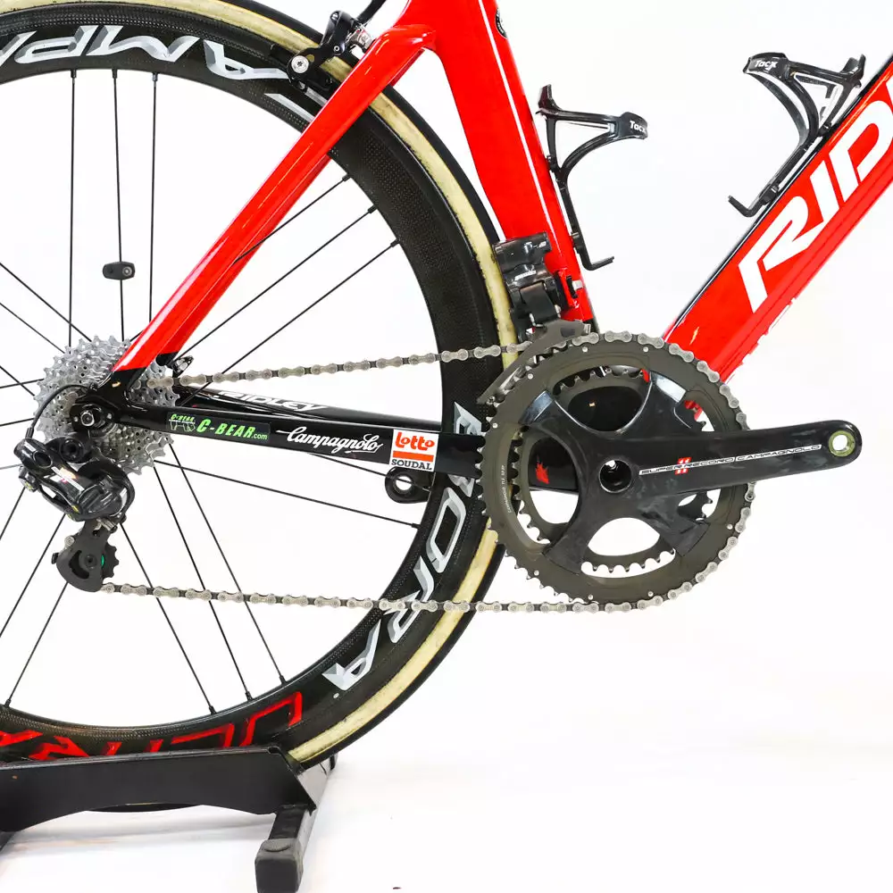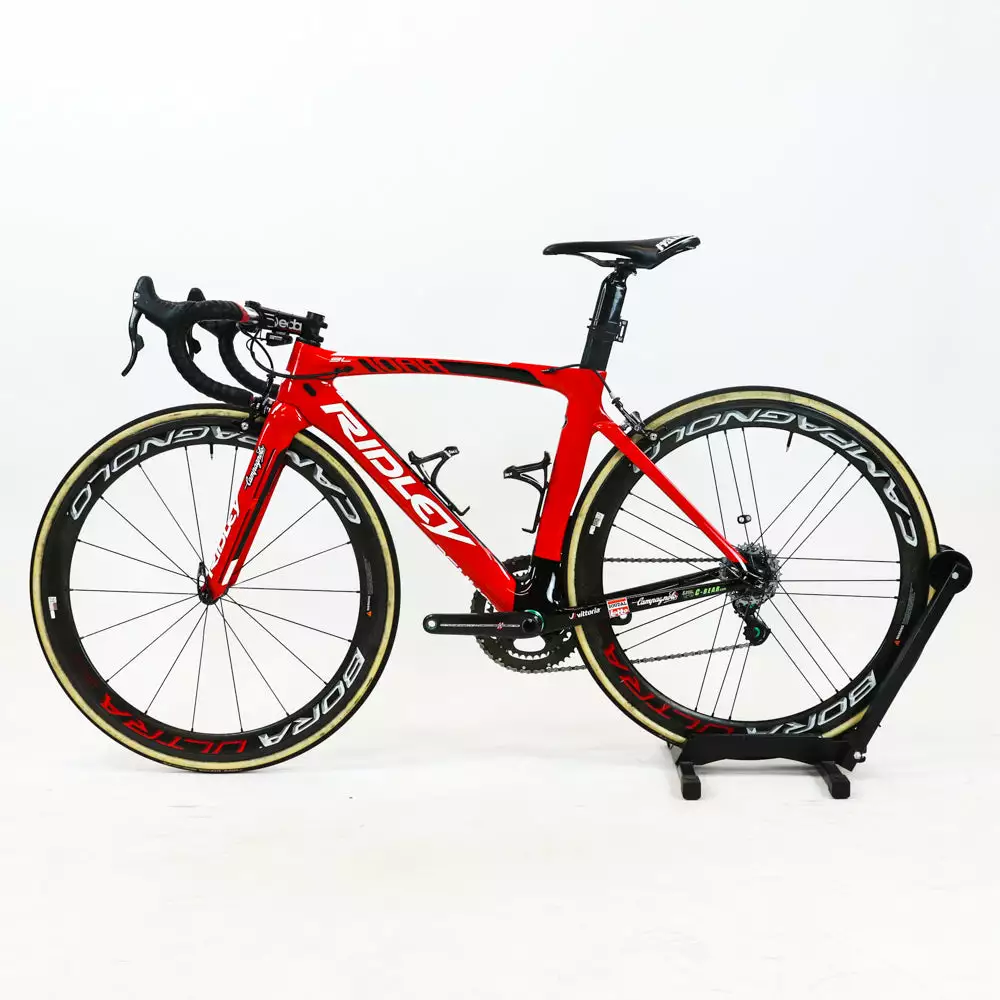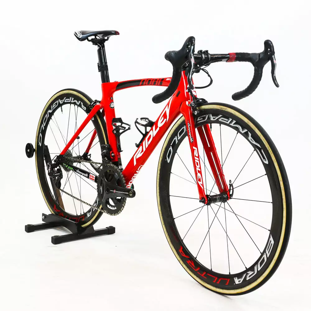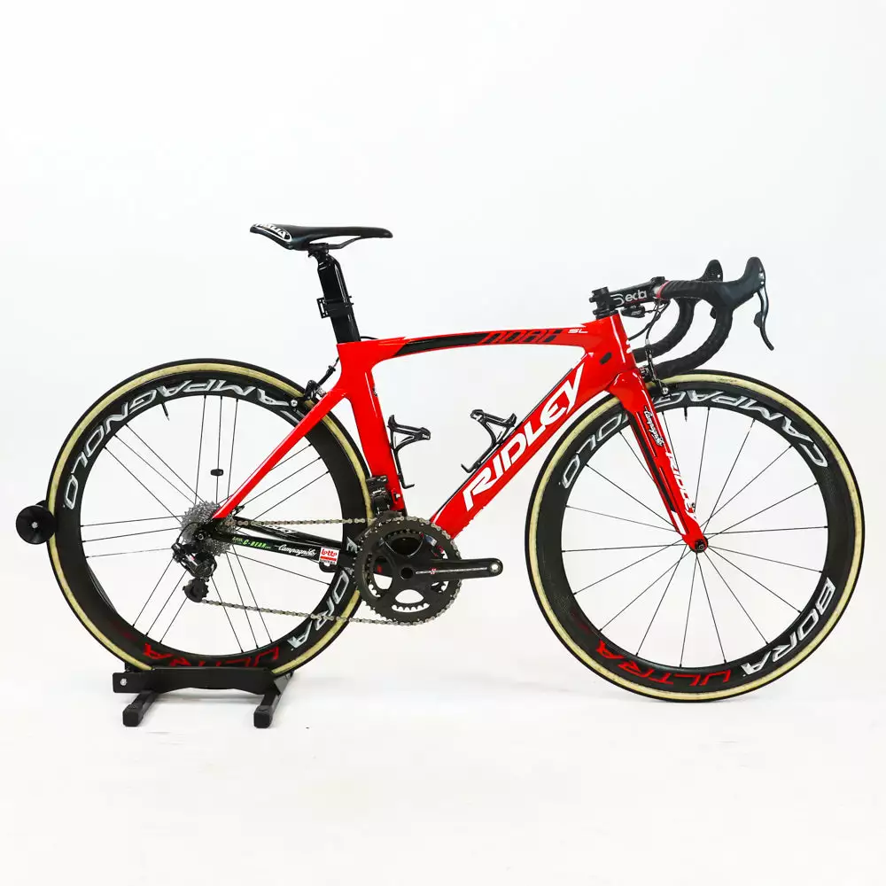 Ridley Noah SL carbon road bike with rim brakes and Campagnolo Super Record EPS 11-speed groupset featuring a Campagnolo Bora Ultra 50 carbon wheelset.
