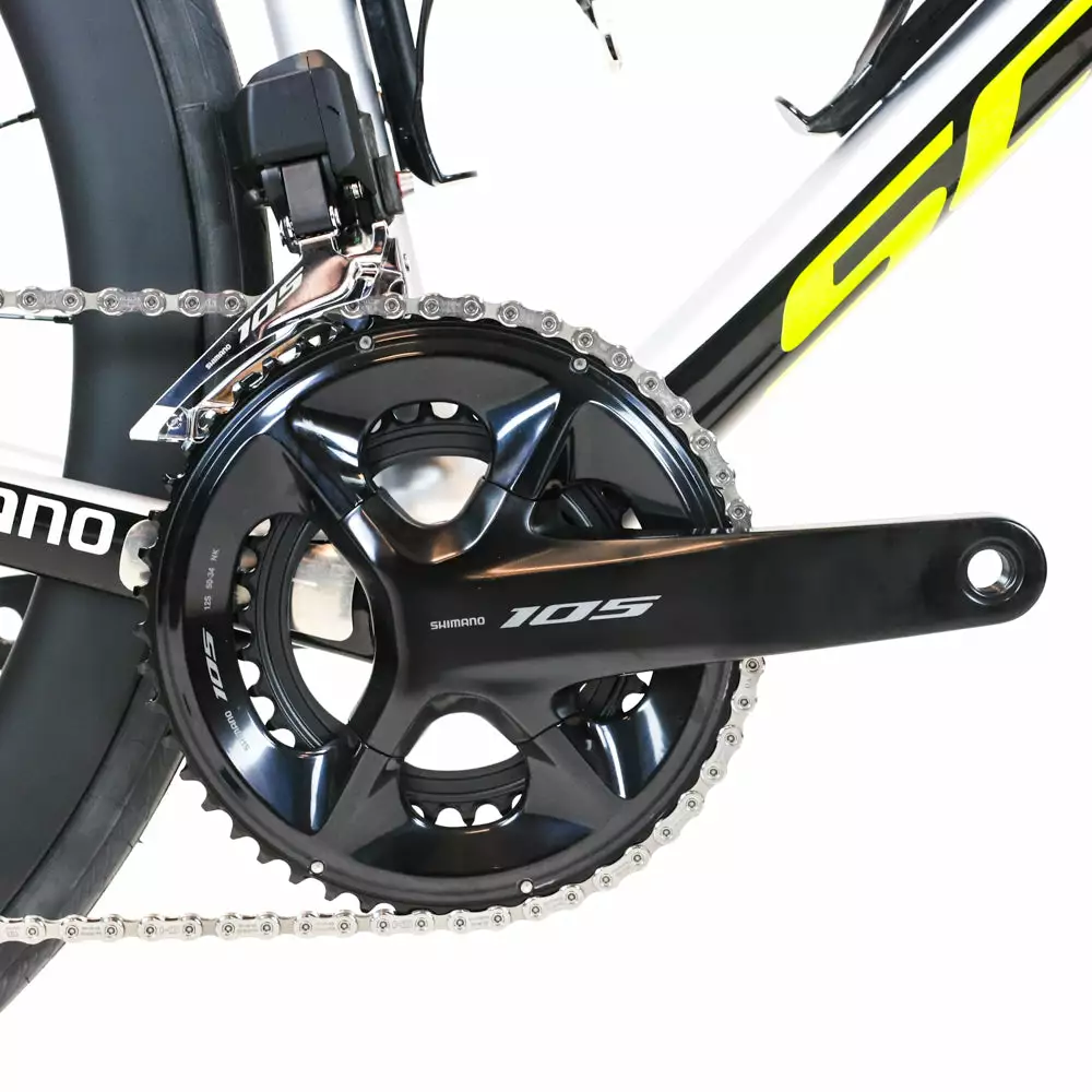 The bike frame and components are brand new. The bike is built with the new Shimano 105 Di2 12-speed groupset, team-specific Syncros components, and a Shimano disc carbon wheelset.