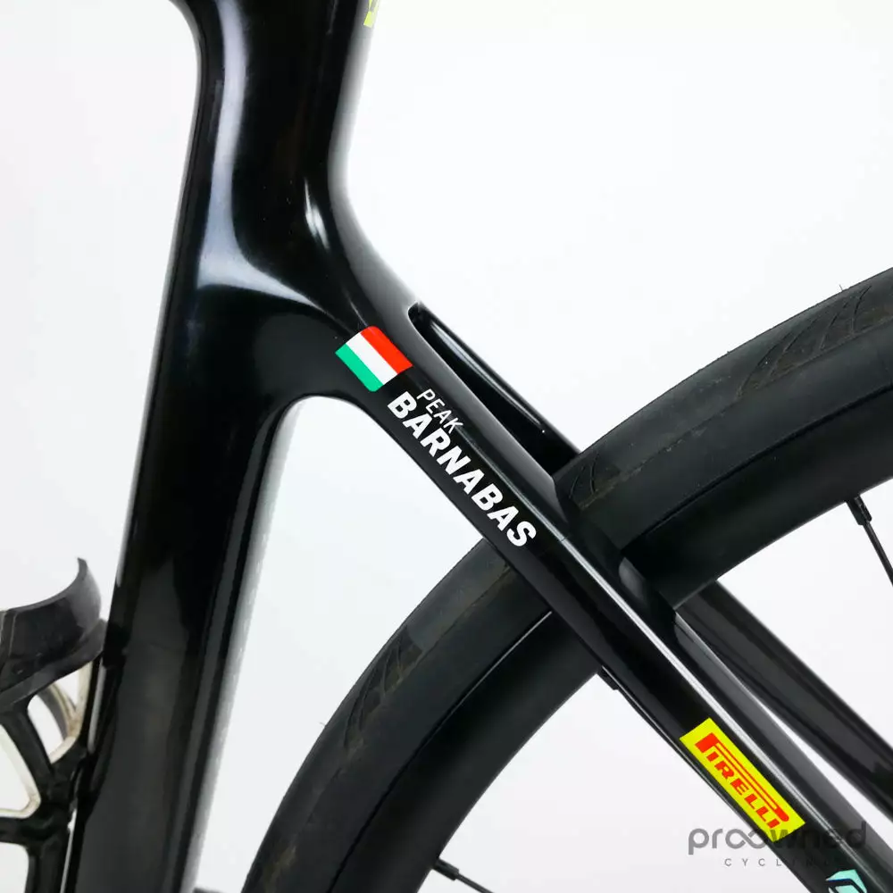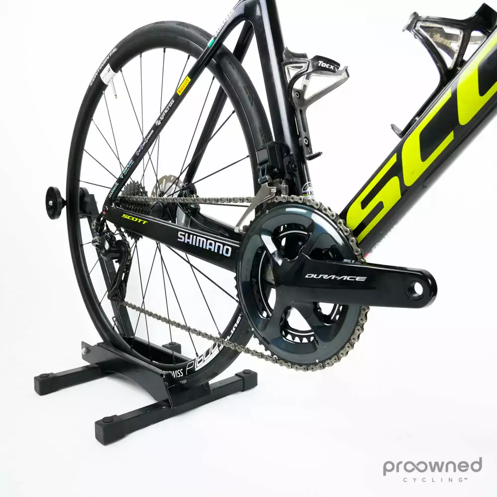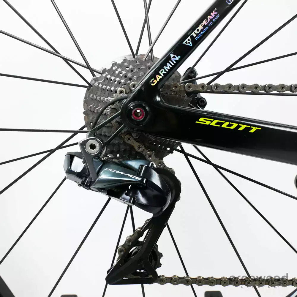 The team mechanics have well maintained this bike, and our Mechanic has furthermore restored it. It is equipped with the top-of-the-line electronic Dura-Ace 9170 2×11 speed Disc groupset by Shimano.