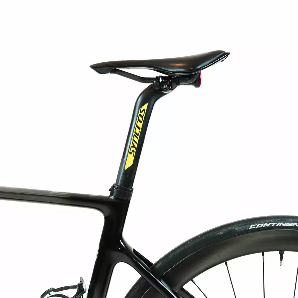 The bike frame is in Very good condition, and some of the components are As new, other more used – please see the details below. The bike is built with a Shimano Di2 groupset, team-specific Syncros components, and a Rebel Royal Carbon disc wheelset.
