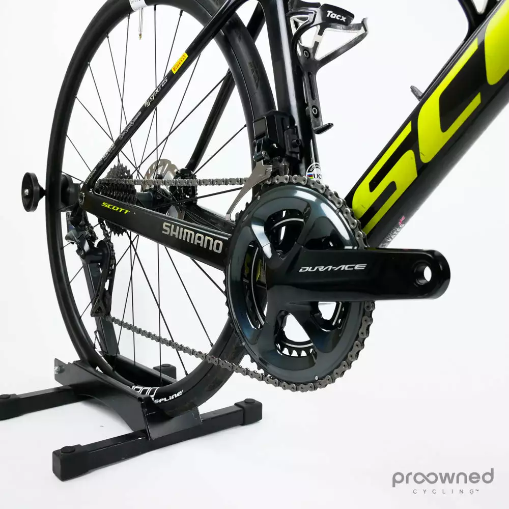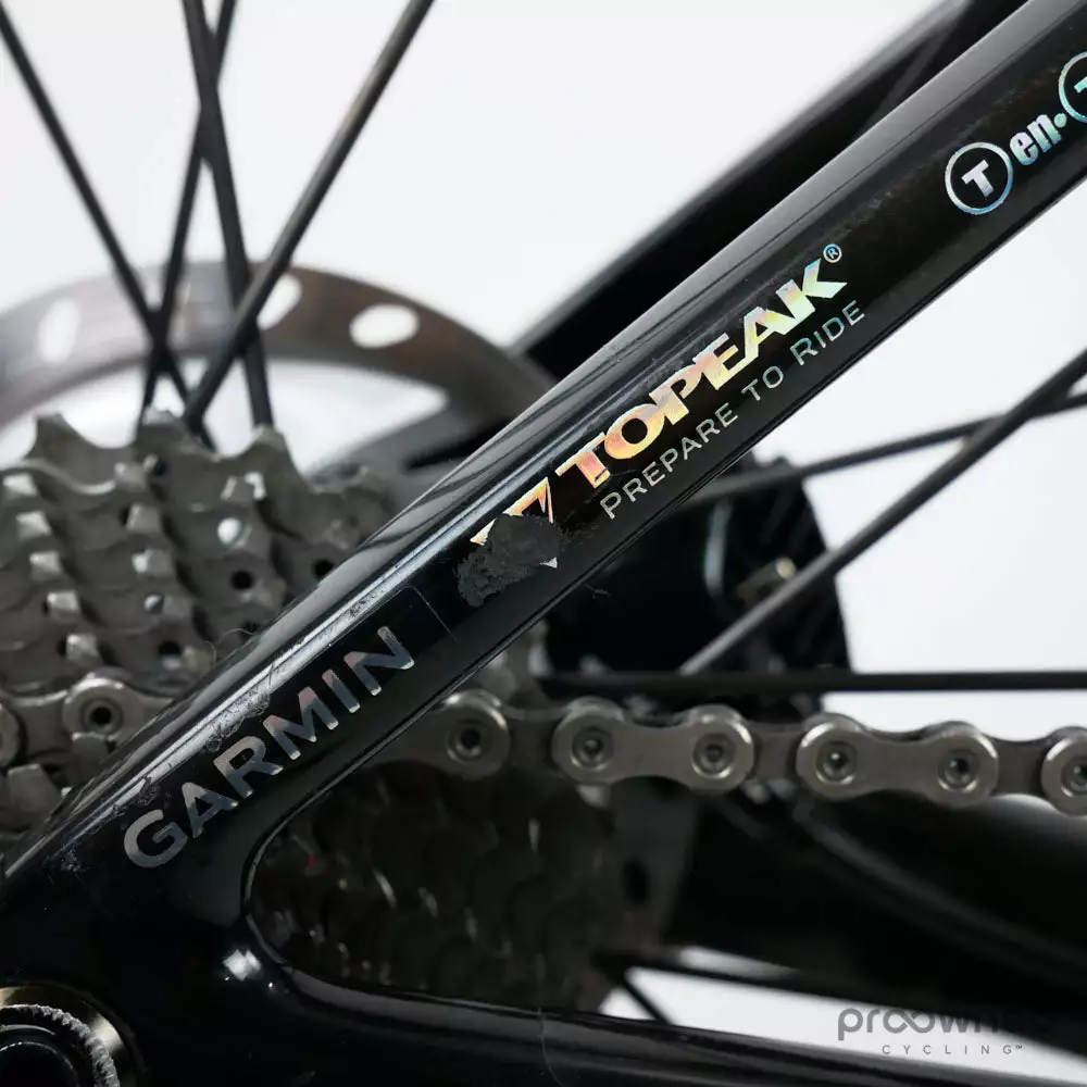 The team mechanics have well maintained this bike, and our Mechanic has furthermore restored it. It is equipped with the top-of-the-line electronic Dura-Ace 9170 2×11 speed Disc groupset by Shimano.