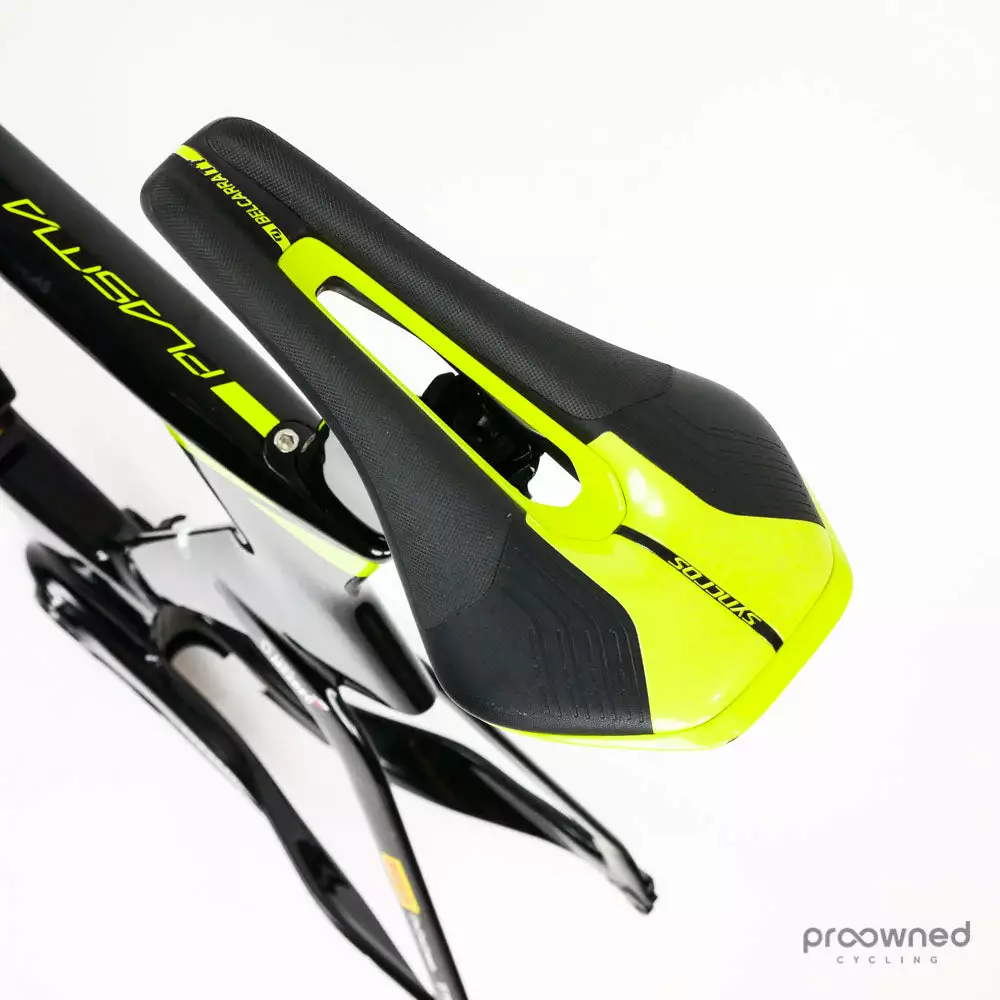 The Scott Plasma 5 HMX is the ultimate weapon in the race against the clock. Thanks to Scott’s restless aerodynamic refinement the Plasma 5 has proven itself to be an uncompromising speed machine. The HMX carbon lay-up is designed to maximize stiffness to ensure that every watt is transformed to speed.